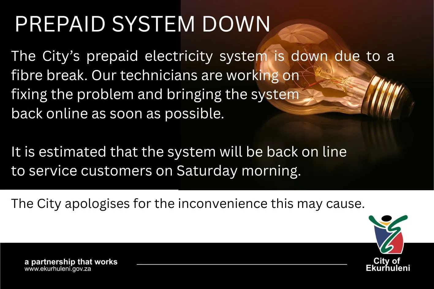 A user was having trouble buying prepaid electricity. Other users confirmed that the system for purchasing electricity is offline due to a problem. One user said that on the Capitec app it says "we are currently experiencing difficulty validating your meter number". One user is in KwaZulu-Natal and another is in Brakpan, Gauteng. One user reported that it is working. FNB and Thyme bank are also reportedly having issues. The prepaid electricity system is down due to a fiber break, and technicians are working to resolve the issue. The system is expected to be back online by Saturday morning.