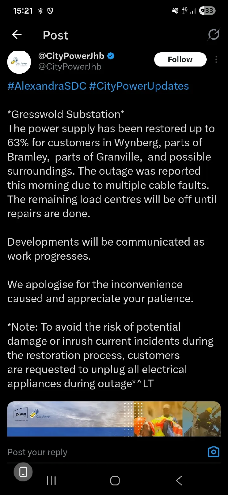 Highlands North is experiencing a power outage, particularly on 8th and 10th Avenues. Residents on 5th, 6th, 9th, and 11th Avenues, as well as Douglas Street, are also affected. One resident is having trouble reporting the outage to City Power via phone. City Power Jhb reports that power has been restored to 85% of customers in Wynberg, Bramley, and Granville after cable faults. Eleven load centers will remain off until repairs are completed. Power is still out on 11th Avenue.