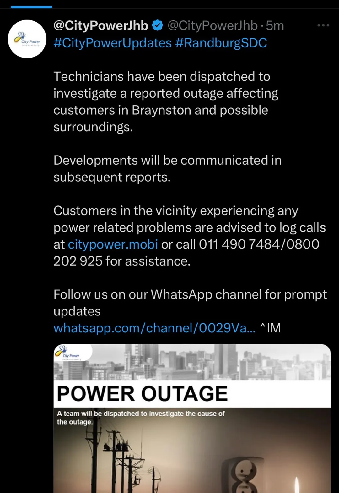 A user reported a power outage on Bryanston Drive. Others reported outages on Westminster Avenue, Chester Road, Petunia Street, Bryanston main, Grosvenor Road, Ormonde Street, Winchester Bryanston and Mitcham Lane. Two users logged calls with CP, reference numbers CPWEB4776563 and CPWEB4776556. Power is also off in Lyme Park, Highland and Stirling. Power has returned to Chester Road, Bryanston Drive, Vlok Road and Dover Road. Power is off on Main Road Bryanston. City Power has assisted with updates on X. Power is still out in Westminster Avenue. Power is also off on Moray Drive. Power is off in Old Kilcullen Road bryanston ext 7. Power is on in Moray Drive.