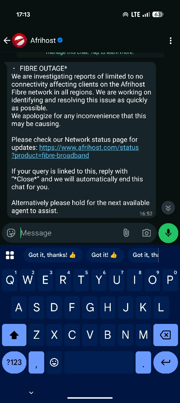 A user reported that Afrihost was down in Green Point. Another user also had no internet and couldn't contact Afrihost. Another user reported that Octotel was fine. An image was shared stating that Afrihost was experiencing a fibre outage. A user was not receiving notifications from Afrihost. A user said the internet was back on, but another user said it was not back on for them yet. Afrihost stated there was a connection error with fibre cables and a team was working on it. The internet is now working.