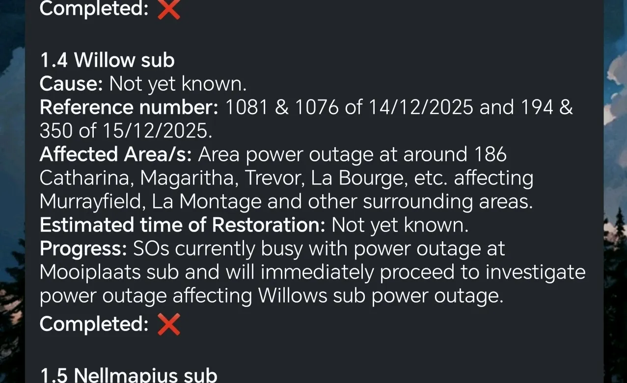 On December 14, a power outage was reported on Mispel Avenue in Lydiana. Outages also occurred in Jup Brummeria and Lydiana, affecting several areas due to the Willows substation. A faulty mini substation and medium voltage cable caused the outage. A mini sub has been fitted to the base and the electrical team is connecting cables. There is an 80% chance of rain tomorrow from 14h00.