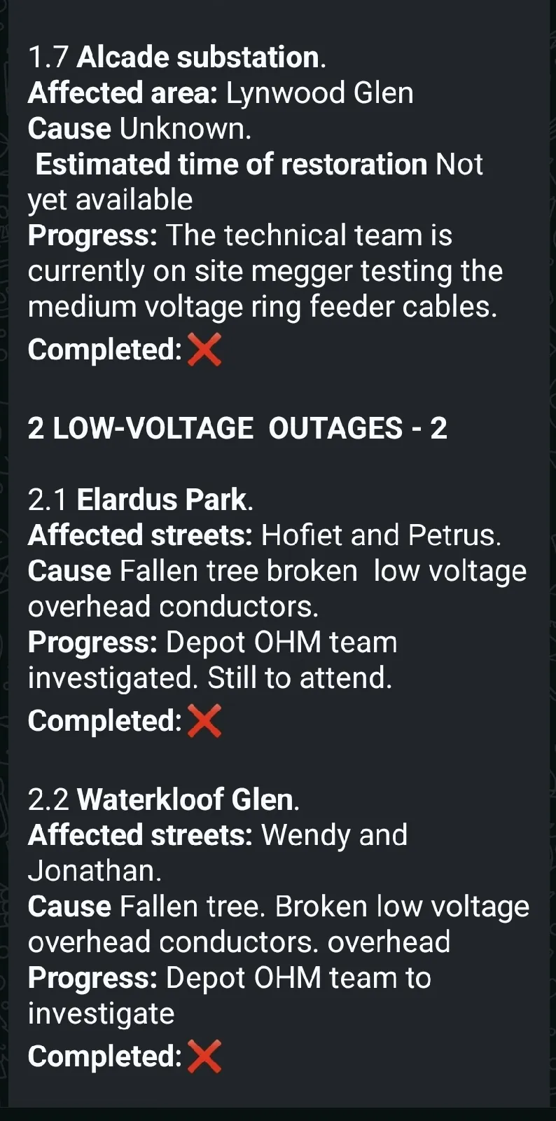 A user reported a possible power outage in Moreleta Park. A tree fell on overhead conductors at Holgate substation, affecting Moreletapark Park, Elarduspark Park, and the R118 medium voltage rural line. The estimated time of restoration is not yet available. Another outage is affecting Pretoria East Hospital, Netcare/Garsfontein, Rockwood/Thornwood, and Parkview Sub due to a faulty MV cable; estimated restoration is 20:00. Mooikloof substation affecting O61 medium voltage rural line is estimated to be restored at 17:30. Jochem street Rietvalleirand also has no power.
