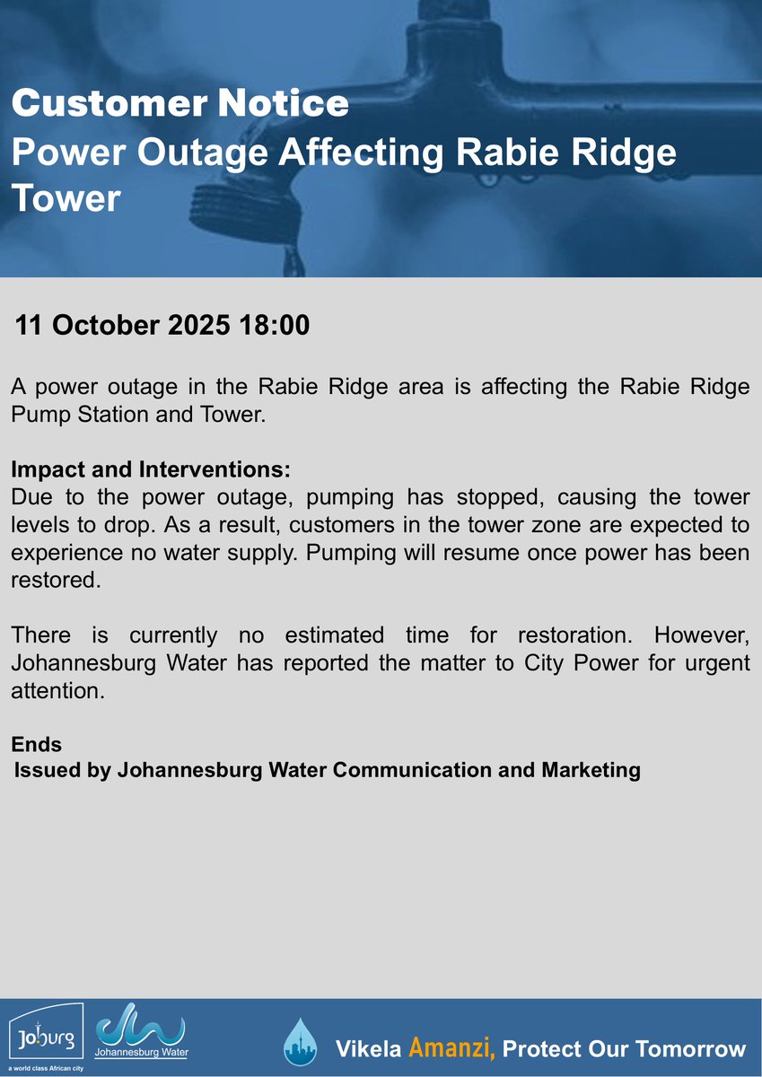 Rabie Ridge is experiencing a power outage affecting the Rabie Ridge Pump Station and Tower. This has resulted in no water supply for customers in the tower zone. Urgent attention has been requested from City Power to restore electricity and resume water pumping.