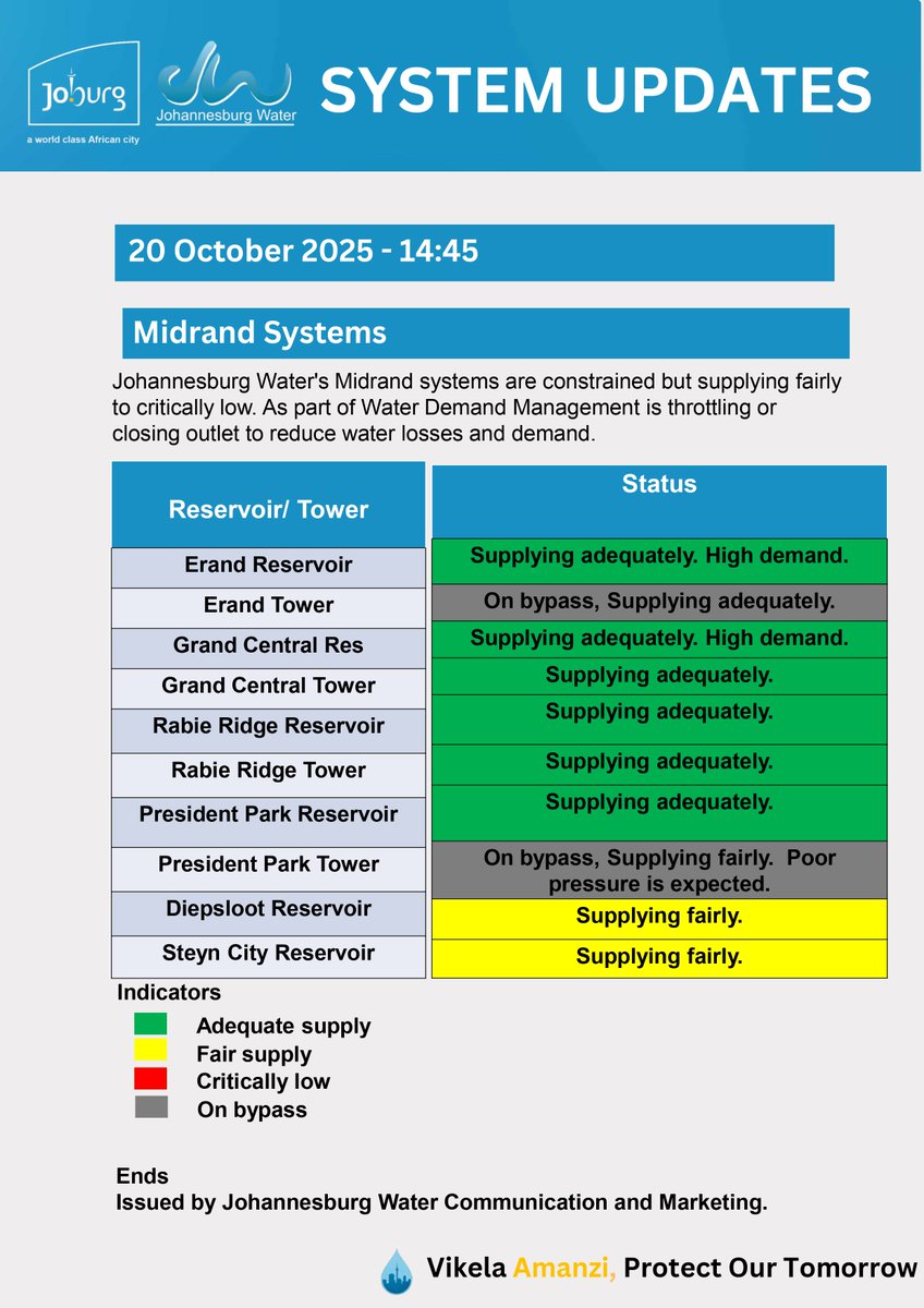 Midrand is facing water supply challenges, with reservoirs like Erand, Grand Central, and Rabie Ridge under high demand. Critical shortages are noted at Rabie Ridge Tower, impacting service delivery and water access.