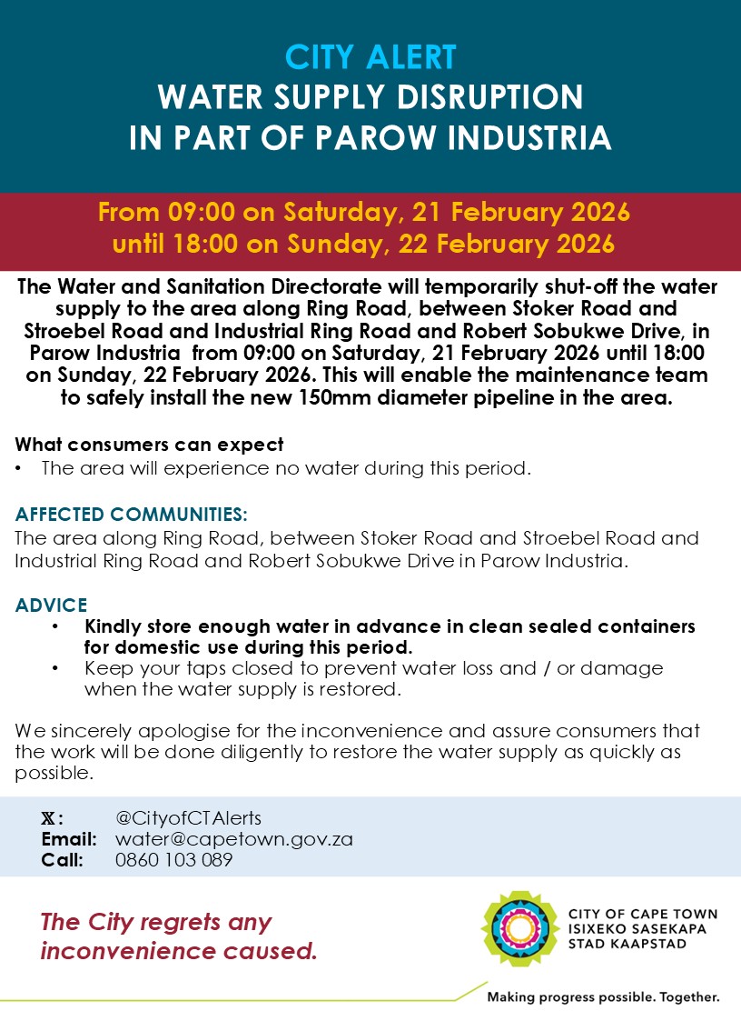 There will be no water in parts of Parow Industria from 09:00 on February 21 until 18:00 on February 22. The affected areas include Ring Road between Stoker Road and Stroebel Road, Industrial Ring Road, and Robert Sobukwe Drive. Please store water in advance for this shut-off.