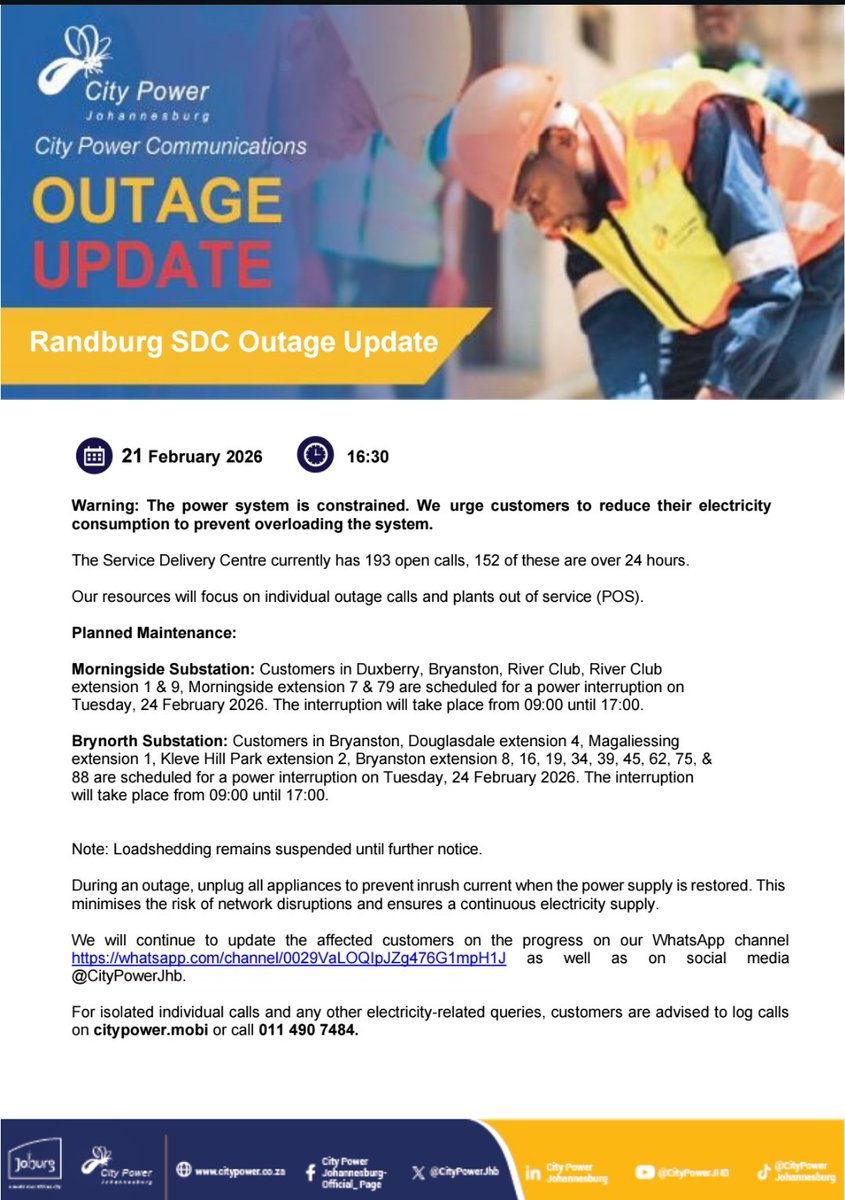 Power interruptions are set for February 24, 2026, from 09:00 to 17:00, affecting multiple extensions. Areas affected include Duxberry, Bryanston, River Club, Douglasdale, and Magaliessing. Urgent reduced consumption is urged due to system constraints. 193 outages have been reported.